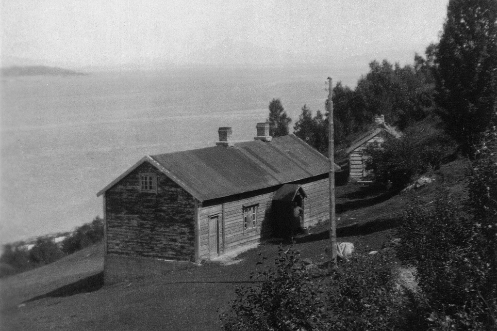Ole Lia ca 1930. Ope kulturlandskap, hus og utsikt over fjorden. Spor av menneskelig aktivitet. Foto: ukjent, utlånt av Edmund Melkild
