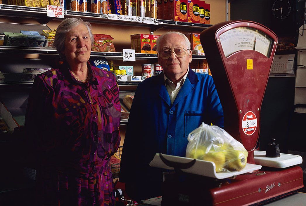 Frå landhandelen på Rekdal i 1997, Kaspara og Olav Gjelstenli. Legg merke til vekta og prislappen. Landhandlarfamilien lever ikkje lenger. Foto: Edmund Melkild
